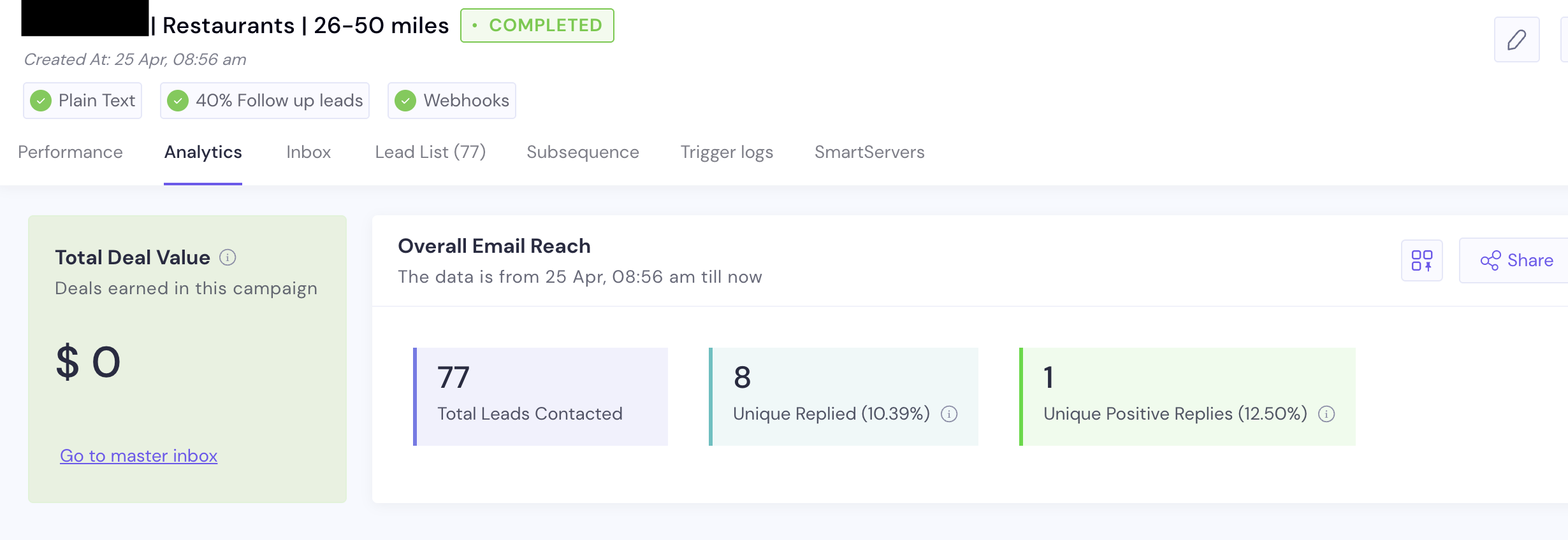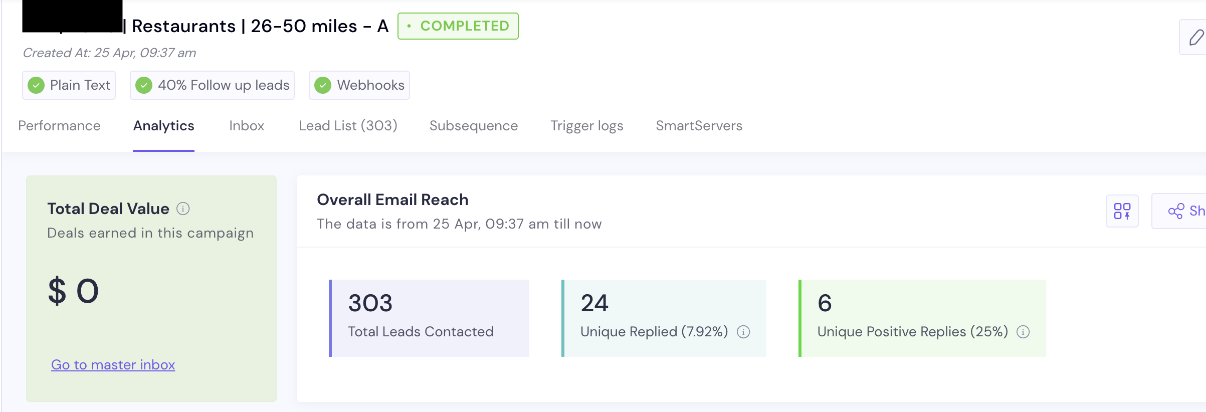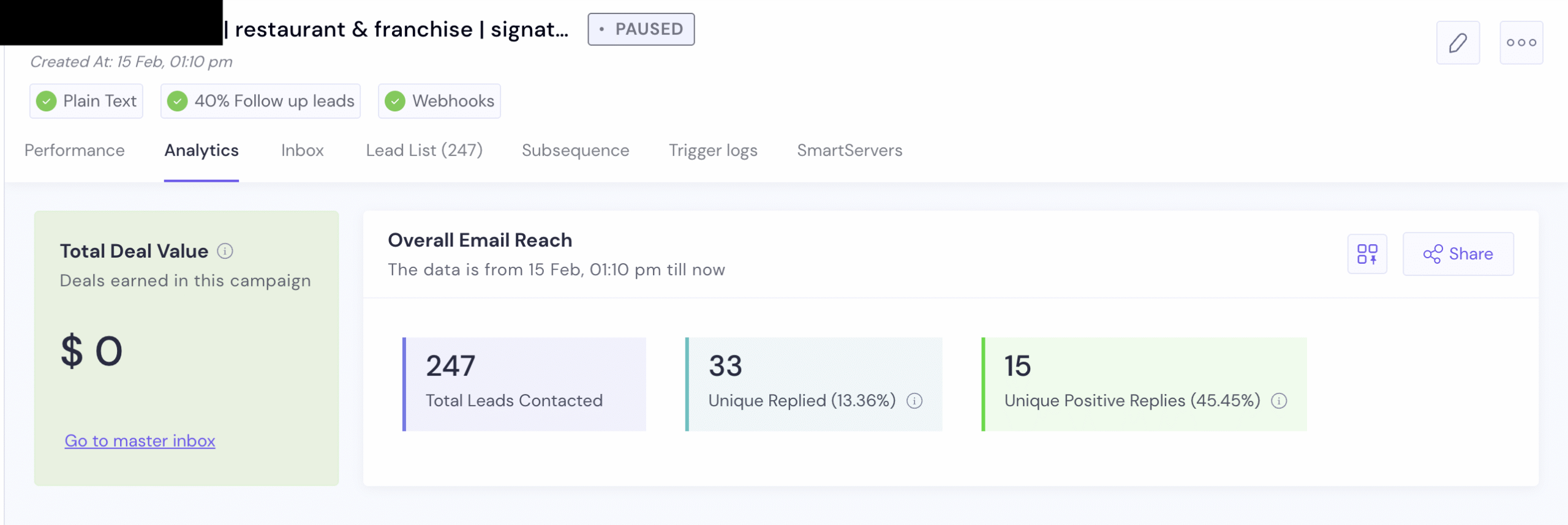 • Best Performing Campaign – “Signature Dish”: 247 emails sent → 33 replies → 15 qualified leads